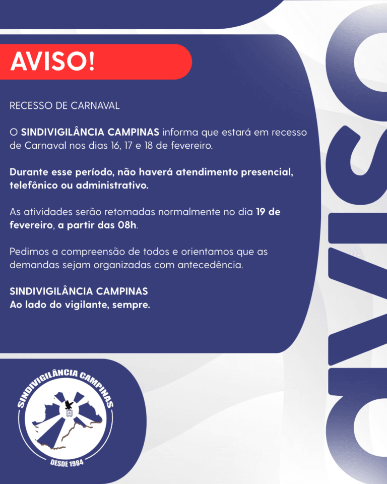 “O Sindivigilância Campinas é movido pelo compromisso de garantir que cada trabalhador em segurança privada tenha voz ativa, condições justas de trabalho e seja valorizado pelo serviço essencial que desempenha. Lutamos por jornadas equilibradas, benefícios dignos, treinamento constante e pelo respeito à saúde e segurança do vigilante. Acreditamos que proteger vidas e patrimônios começa com a valorização de quem se dedica a essa missão todos os dias. Nosso sindicato também promove ações sociais e iniciativas de qualificação profissional, com atenção especial à inclusão daqueles em situação de vulnerabilidade. Trabalhamos para fortalecer a união da categoria, assegurando que todos tenham as mesmas oportunidades e direitos.”